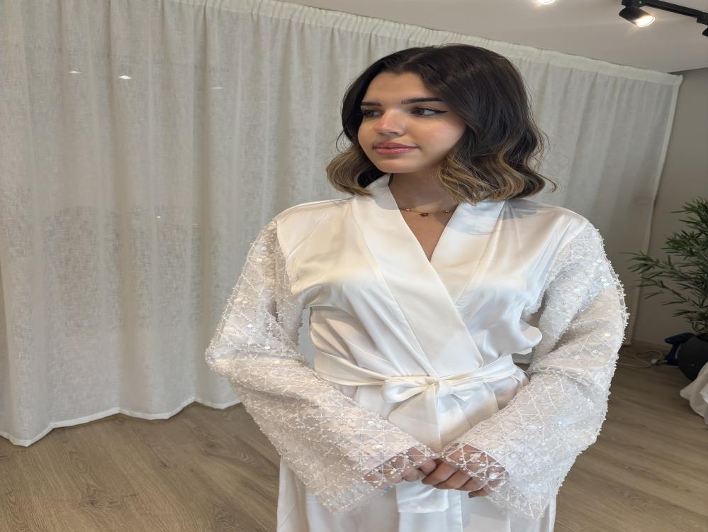 صُمم من ساتان ناعم يلفّكِ بأناقة، ويتميّز بأكمام تول مطرزة بتفاصيل لؤلؤية ساحرة تضيء لحظتك الأولى.