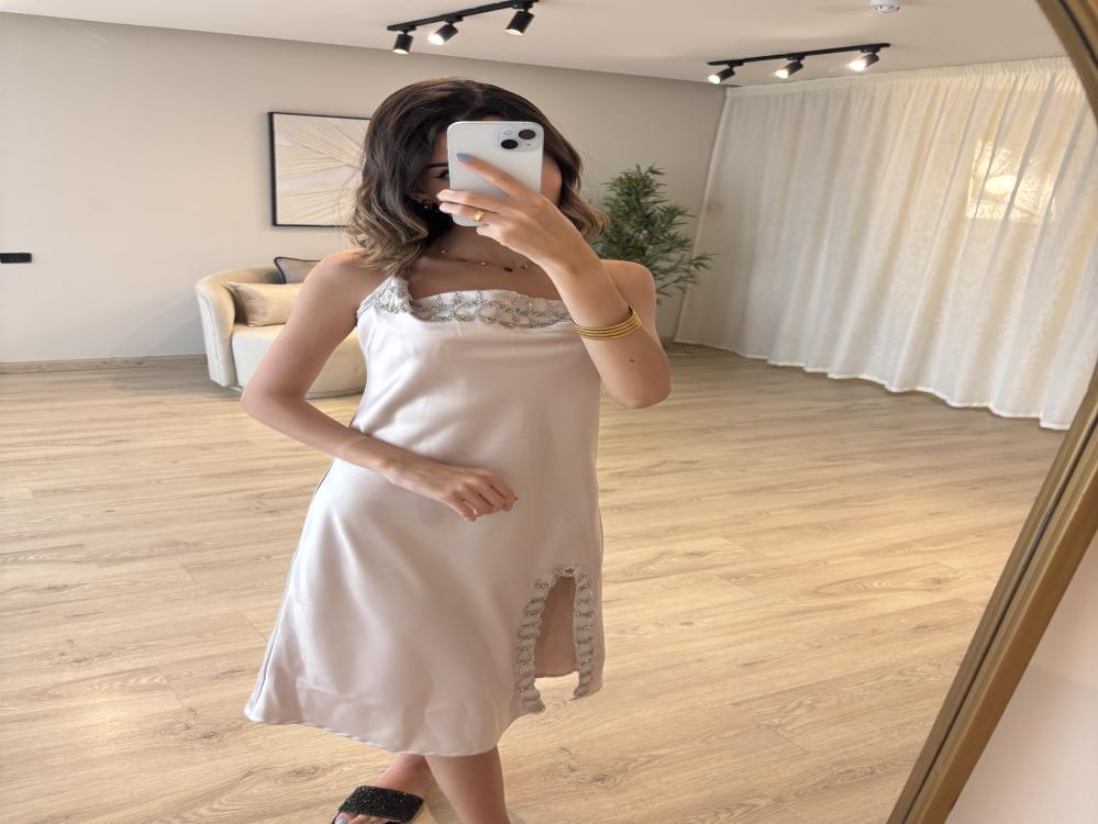 طقم روب وفستان أنثوي ناعم، مصنوع من قماش ساتان فاخر ينساب برقة على الجسم. يتميز الروب بأكمام شفافة مطرزة بلمسات فضية براقة تضيف له فخامة وأناقة مثالية لإطلالة العروس في ليلة العمر