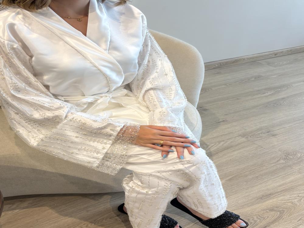 بجامة فاخرة بتفاصيل شك ناعمه على قماش التفته الحريري تنفرد بالأنوثة والفخامه تصميم يجمع بين الخفه والرقي لتكوني في أجمل طلة حتى بلحظات الراحة مثالية للعرائس ولكل أنثى